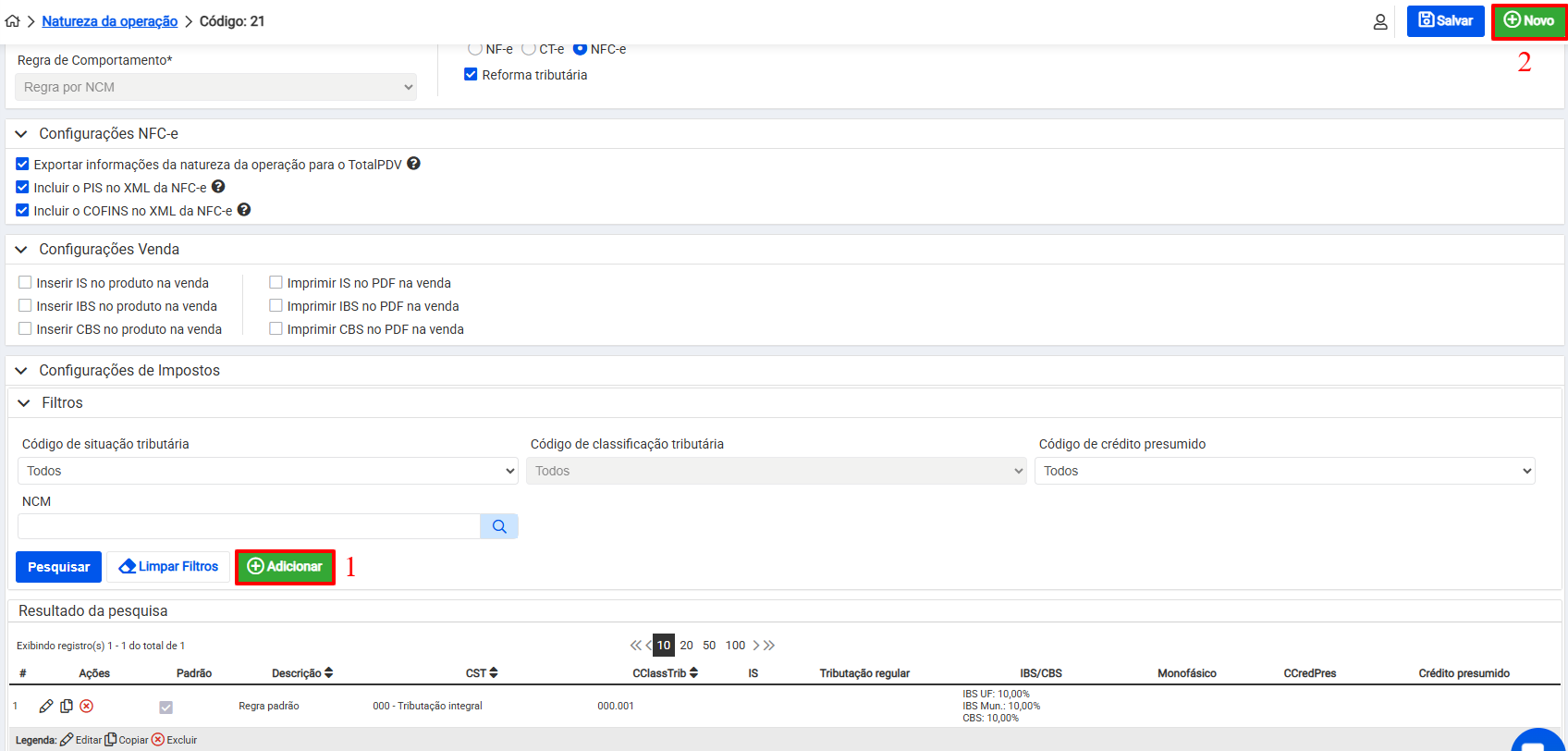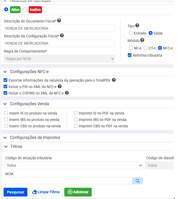 Importante: Devido à quantidade de novos campos implementados na reforma tributária, não será possível incrementar as naturezas da operação já utilizadas. É necessário cadastrar novas naturezas da operação.