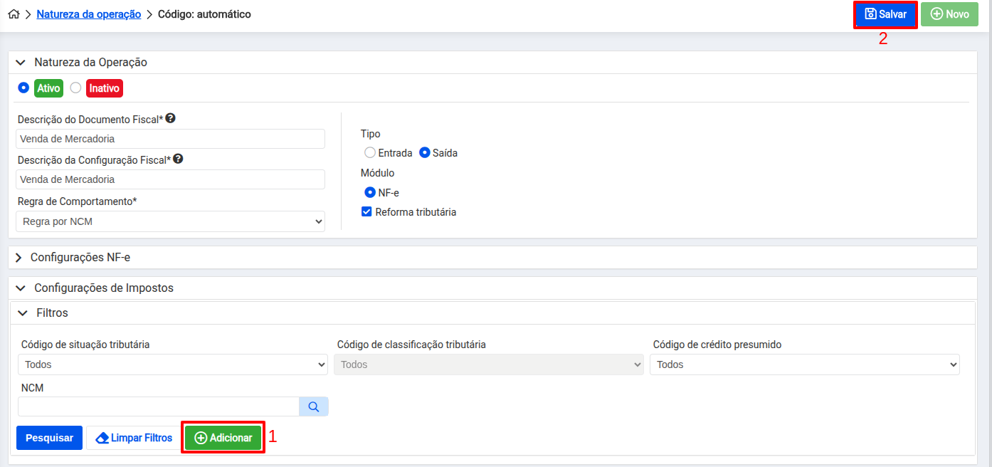 Com isso preenchido, clique no botão Salvar, você será redirecionado para visualizar suas regras dessa natureza da operação, caso deseje cadastrar novas regras, clique no botão Adicionar (1), senão, clique no botão Salvar (2).