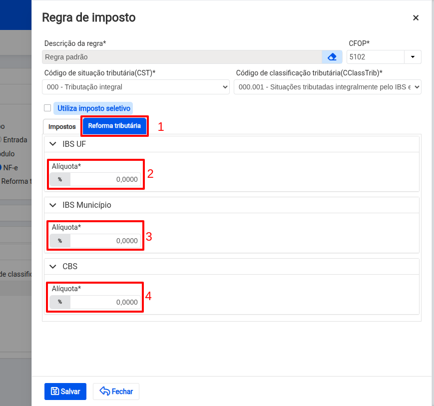 5 - a caixa de seleção Reforma Tributária, essa opção irá habilitar os campos disponíveis para a Reforma Tributária.