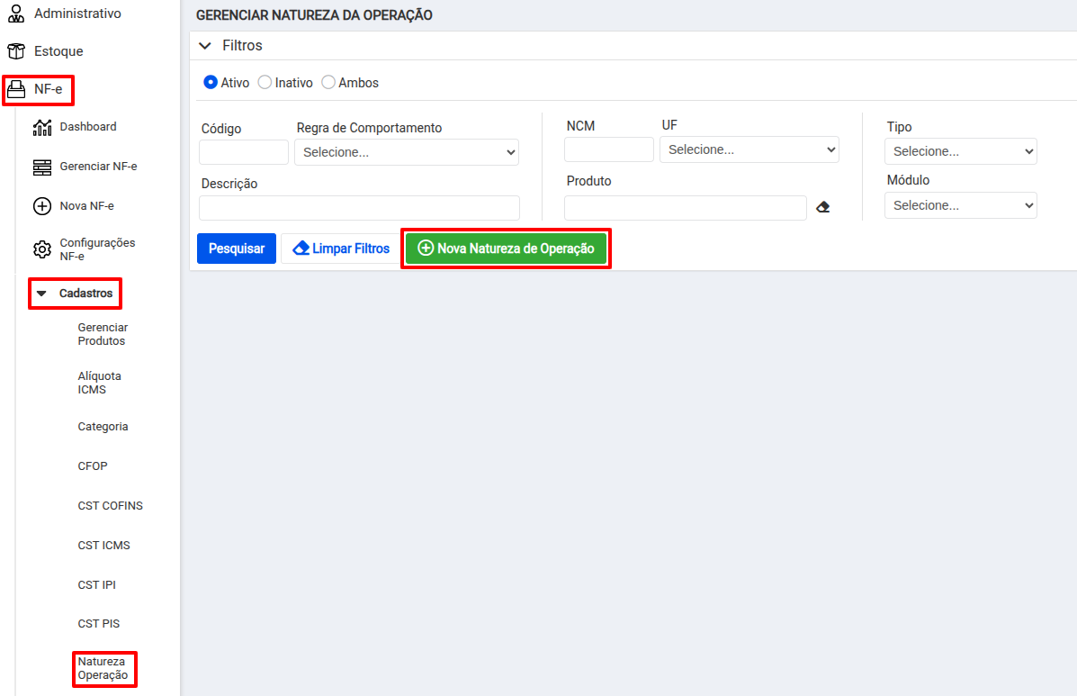 Para o cadastro da Natureza da operação com os novos impostos do IBS, CBS e IS, acesse no menu lateral do TotalERP o Módulo NF-e > Cadastros > Natureza da Operação e clique no botão Nova Natureza de Operação.