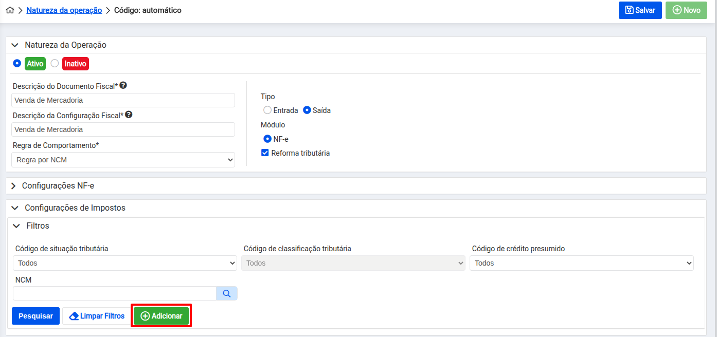 Importante: Devido à quantidade de novos campos implementados na reforma tributária, não será possível incrementar as naturezas da operação já utilizadas. É necessário cadastrar novas naturezas da operação.