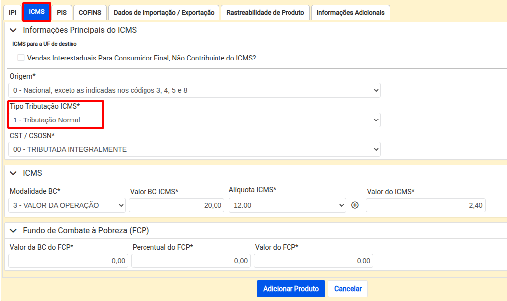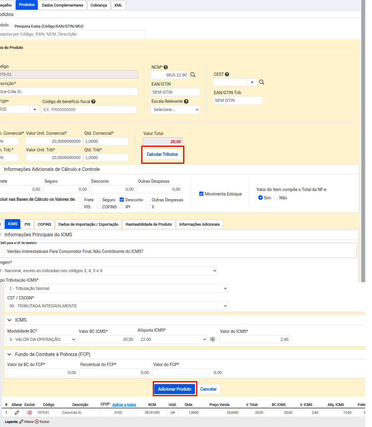 Com os campos corrigidos, clique em Calcular Tributos e em seguida Adicionar Produto.