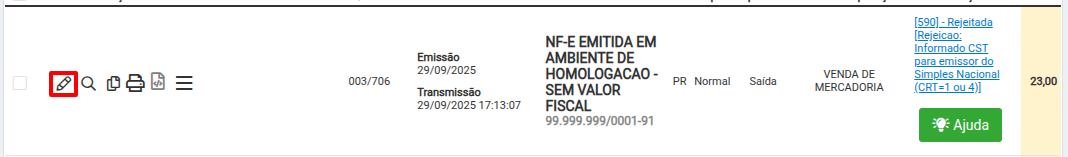 Após validar qual CST usar, devemos editar a NF-e rejeitada para corrigir o campo. Para isso, acesse NF-e > Gerenciar NF-e > Clique no lápis para editar.
