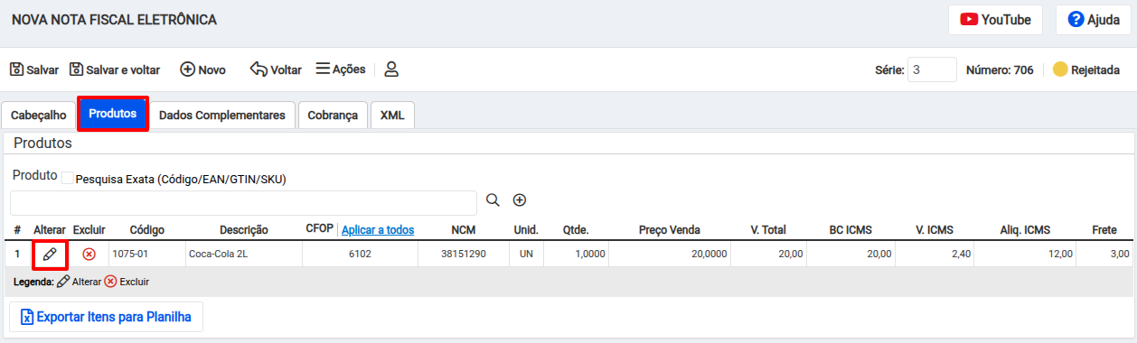 Acesse a aba ''Produtos'' e clique no lápis para editar a NF-e.